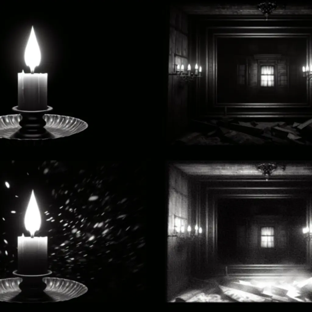Rdzeniem White Night jest kontrast światła i cienia. Zobacz jak czysta czerń, świece i ziarnista faktura budują napięcie równie skutecznie jak dźwięk i narracja.